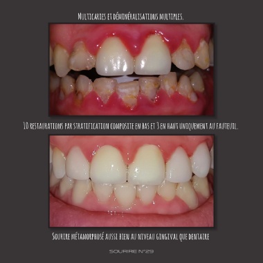 10 restaurations par stratification composite en bas et 3 en haut uniquement au fauteuil.